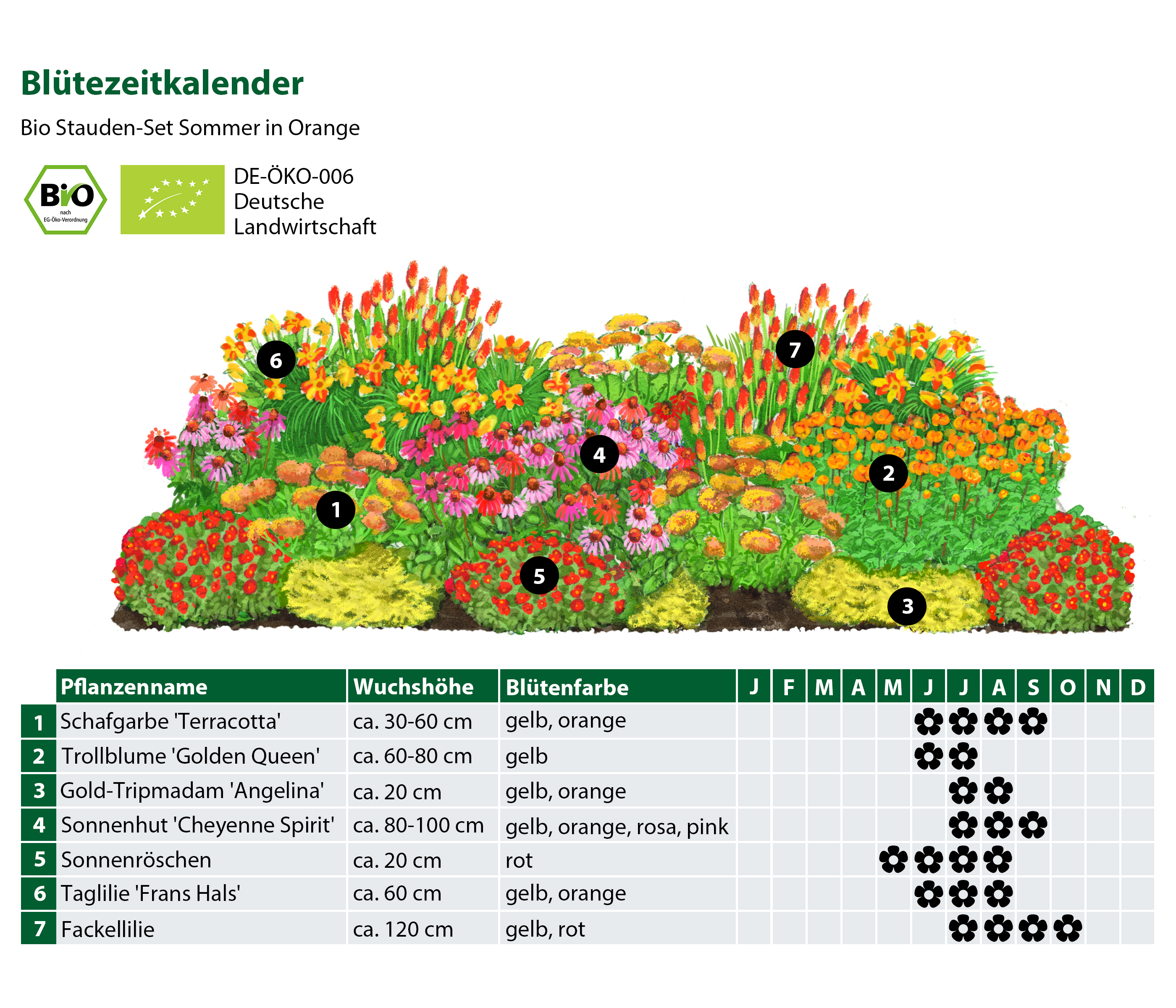 Set aus 24 Bio Pflanzen: 3x Schafgarbe 'Terracotta', 3x Sonnenhut 'Cheyenne Spirit', 3x Sonnenröschen rot, 3x Taglilie 'Frans Hals', 3x Fackellilie, 6x Gold-Tripmadam 'Angelina', 3x Trollblume 'Golden Queen'