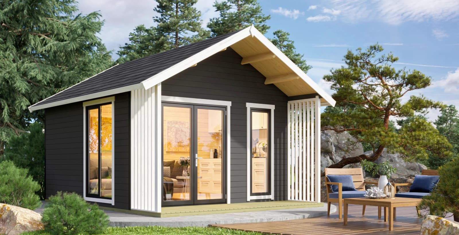 •  Größe & Dach: Ein Gartenbüro sollte mindestens 6–10 m² groß sein, um ausreichend Arbeitsfläche zu bieten. Die Wahl der richtigen Dachform beeinflusst nicht nur die Optik, sondern auch die Funktionalität Ihres Gartenbüros. Ein Flachdach verleiht Ihrem Gartenbüro eine moderne, minimalistische Optik. Zur optimalen Lichtnutzung ist ein Pultdach ideal. Das Satteldach ist eine bewährte Wahl, bietet zusätzlichen Stauraum unter dem Dach und hält auch starken Witterungsbedingungen stand. Ein Walmdach ist ebenfalls stabil und sorgt für einen Hingucker im Garten.